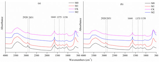 C–OH stretching of alcoholic groups (peak 1158 cm−1), OH deformation, and C–O stretching of phenolic groups (peak 1375 cm−1), aromatic C=C (peak 1644 cm−1), aliphatic C–H stretching (peaks 2920 and 2851 cm−1) were found in all studied soils (Figure 2). The intensity of the peaks at 1158 cm−1, 1375 cm−1, 1644 cm−1, 2851 cm−1, and 2920 cm−1 were significantly stronger in M0 and M1 in both soil layers analyzed, than in CK and M2 (Table 2). The ratio of the peaks at aliphatic C–H (2851 cm−1 + 2920 cm−1)/aromatic C=C (1644 cm−1) was calculated as the parameter to describe soil hydrophobicity (repellency) or C chemical recalcitrance. The higher this value, the more stable the SOC present. In the present study, M0 sites exhibited a higher hydrophobicity index than CK did, followed by M1, while M2 had the lowest hydrophobicity index.
