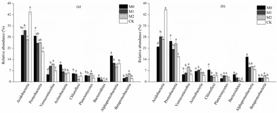 Alphaproteobacteria was the most abundant (9.1%–16.3%) class in all studied soils. The relative abundance of Alphaproteobacteria in M0 soil was significantly higher than those in M2 and CK soils (p < 0.05). By contrast, in the M2 sites, the relative abundance of Betaproteobacteria was significantly higher in both soil layers, compared to those in other soils (p < 0.05).