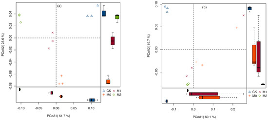 Principal coordinates analysis (PCoA), based on weighted UniFrac distance, which is the weighted sum of the branch lengths in a phylogenetic tree of the sequences from the communities, was used to determine whether the two communities differed. The first two principal coordinates for the topsoil and subsoil layers represented 85.3% and 79.8% of the variation in the bacterial communities, respectively (Figure 4). Clear separations were observed between the secondary forest and Moso bamboo plantations in both the soil layers along the first principal coordinate, which indicates a large shift in the bacterial community structure. A significant difference in bacterial community structure between M0 and M2 was also detected, indicating that the disturbance of forest management significantly altered the bacterial community structure.