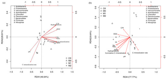 RDA (redundancy analysis) was carried out to discern the relationships of bacterial community structure and TOC with DOC content, C/N ratio, and other soil variables (Figure 5). The first two axes of the RDA accounted for 75.45% and 87.41% of the total variance in bacterial community composition in the topsoil and subsoil, respectively. From the results of a Monte Carlo permutation test, we identified DON (F = 25.6, p = 0.001), soil pH (F = 24.1, p = 0.001), DOC (F = 15.2, p = 0.002), TN (F = 6.9, p = 0.017), TOC (F = 6.1, p = 0.033), and C/N ratio (F = 5.0, p = 0.047) as being the six most important contributors to variation in the topsoil bacterial communities, as they individually accounted for 27.7%, 26.1%, 16.5%, 7.4%, 6.6%, and 5.4% of the variation, respectively. Other factors, such as C mineralization rate, cumulative C mineralization, soil hydrophobicity, and TP content, explained 3.8%, 2.3%, 1.5%, and 1.5% of the total variance, respectively. Although for the subsoil, all the examined environmental variables together explained 96.9% of microbial community variation between samples, only DON content (F = 9.3, p = 0.047) appeared to have a significant influence.