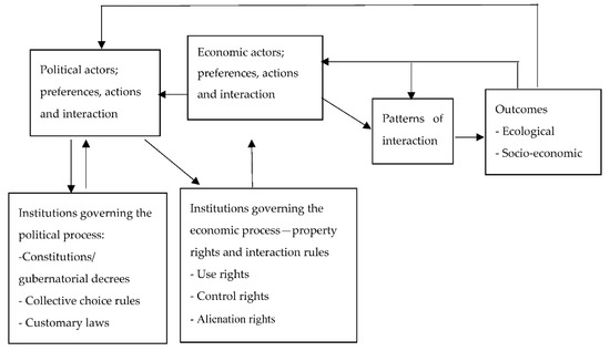 In this paper, we use the environmental governance framework developed by Vatn [26] to conceptualize tenure and property rights to forests in the context of institutional pluralism. These structures of forest governance include actors and institutions (Figure 1). Institutions include rules regarding political decision-making—constitutions, gubernatorial decrees, collective choice rules, or customary laws. These decisions create the second type of institution—i.e., those governing the economic process—like property rights. Such rights comprise three elements: user rights, control rights, and alienation rights. User rights are typically access and withdrawal rights, as defined by Schlager and Ostrom [22]. Control rights, also referred to as second-order rights, determine use rights and include management, exclusion, transaction, and monitoring rights [27].