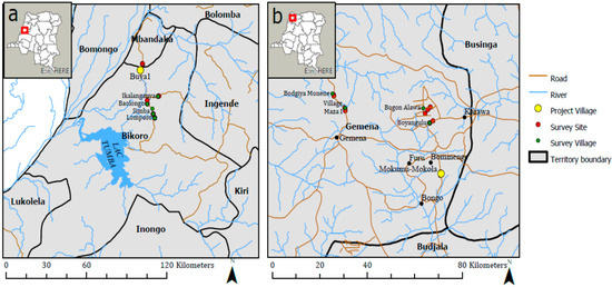 Map of the two pilots in Équateur province: (a) Bikoro territory, Buya 1 project village; (b) Gemena territory, Bokumu-Mokola project village. Source: Chapman (2016).