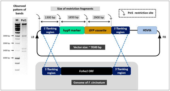 To analyze the plasmid DNA of emerging colonies of E. coli and identify those confirmed to carry the correct deletion construct, individual colonies were inoculated in 3 mL of liquid LB medium amended with spectinomycin. Bacterial cells were then mixed with TENS buffer (Appendix A) and 3 M sodium acetate and centrifuged for 5 min at 14,000 r.p.m. (rotor radius: 7 cm). The resulting plasmid DNA pellets were washed with 70% v/v ethanol and dried at 37 °C for 20 min. Purified DNA was resuspended in double sterilized water (dsw) and digested with the Pst1 restriction enzyme (FastDigest, Fermentas, Vilnius, Lithuania) for 2 h at 35 °C. Digested DNA fragments were run on an agarose gel as previously described to determine the pattern of bands (i.e., four bands pattern: ~9.50 kb, 2.90 kb, 1.65 kb and 1.30 kb; Figure 1). A plasmid DNA with expected digestion pattern of Fcrho1 deletion construct was further purified using the NucleoSpin© Plasmid Easy Pure kit (Macherey-Nagel, Düren, Germany) and transformed into A. tumefaciens strain AGL-1 [20] by electroporation in a GenePulser Xcell (BioRad, Hercules, CA, USA). Bacteria were incubated in liquid LB medium at 28 °C for 2 h prior to selection of transformants on LB plates amended with spectinomycin. These plates were incubated for 48 h at 28 °C at which point the emergence of colonies resistant to spectinomycin was observed. A single bacterial colony harboring the Fcrho1 deletion construct was reserved for ATMT transformation of F. circinatum as described below.