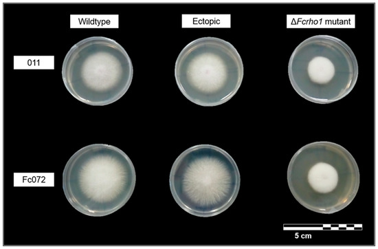 At first, we determined whether the lack of Fcrho1 had an effect on the colony growth rate on solid medium. For that, parental wildtype strains Fc072 and 011, deletion mutants ΔFcrho1Fc072 and ΔFcrho1011 and their corresponding ectopic strains, Fc072ect2 and 011ect5, respectively, were grown on PDA. The growth test included six plates per strain incubated at room conditions (23 °C ± 2 °C; 10–11 h of light per day) for one week. The size of each colony was calculated daily by measuring two perpendicular axes and calculating the area of the corresponding ellipse (Ac). The mean growth rate (G) was calculated as the mean value of colony size increase between two consecutive observations.