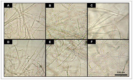 Microscopic morphology of hyphae in 40-days-old cultures. (A) 011 wildtype; (B) 011ect5; (C) ΔFcrho1011; (D) Fc072 wildtype; (E) Fc072ect2; (F) ΔFcrho1Fc072. Image processing: scaling to common size and +20% brightness.
