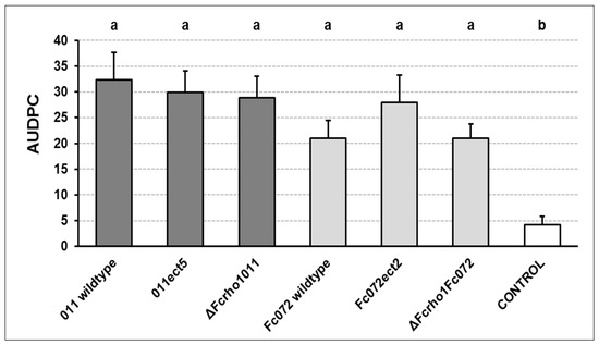 Area under the disease progress curve (AUDPC) of different fungal strains 30 days post inoculation (dpi). Lower-case letters (a–b) indicate significant differences (Dunn’s test, p < 0.05). Comparisons between fungal strains are indicated by color of plot. Mean values and standard error are shown.