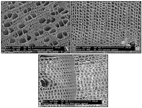 Micrographs of (A) Populus tremuloides Michx. (Trembling Aspen), (B) Pinus banksiana Lamb. (Jack Pine), and (C) Picea glauca (Moench) Voss (White Spruce) sapwood tissues.