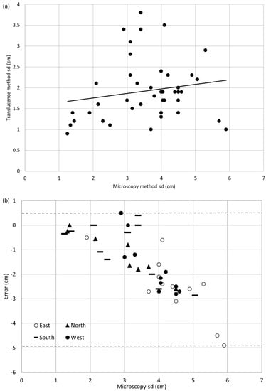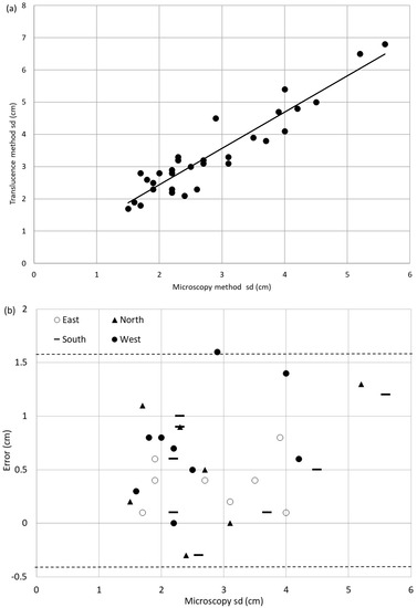 (a) Regression plot of sapwood depth (sd) obtained by the translucence method vs. sapwood depth obtained with microscopy for Picea glauca. The best fit line is shown as a solid line. (b) Errors for Picea glauca sample set distinguished by cardinal direction. The accuracy limits are shown by the dashed lines.