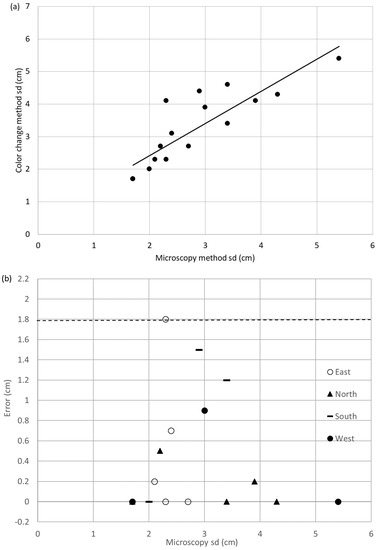 The change in wood color method was used in estimating Populus tremuloides sapwood depths. Starting with a sample set of 140 wood cores, sapwood depth values were obtained in just 17 wood cores using this method due to the complexity of this species’ anatomy. The number of tested wood cores was limited by how problematic it was to distinguish the difference in color between the sapwood and heartwood. Still, the sample size was adequate for performing a paired t-test (α = 0.1 and β = 0.8). The sapwood depth values obtained with the change in wood color method (sdC) and the microscopy method are significantly different (p = 0.012, α = 0.1). The data set and error plots are shown in Figure 4a,b, respectively. The error in the color change method for this species ranged from 0.00 cm to +1.8 cm, with an output span of 3.64 cm and accuracy percentages of 0% to 49.4%. The R2 in the best fit line (Equation (4)) was 0.74.