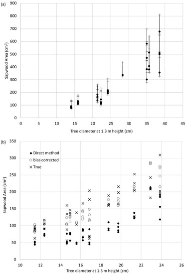 (a) Plot of calculated sapwood area and error bar limits for Picea glauca using the translucence method; (b) computed sapwood areas using sapwood depth estimated with the translucence method and the microscopic method (true) with bias-corrected estimates for Pinus banksiana.