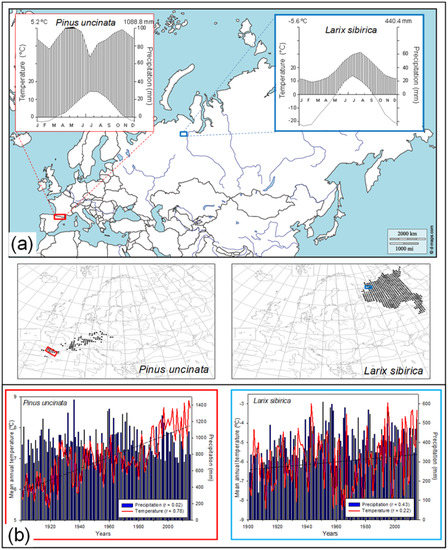 (a) Location of the sampled treelines in the Spanish Pyrenees (Pinus uncinata Ram.) and in the Russian Polar Urals (Larix sibirica Ledeb). The insets show the climatic diagram for each study site and below maps the distribution both species in Eurasia (Atlas Florae Europaeae). (b) Mean annual temperature and precipitation for the studied treelines during the 20th-century. The statistics show climatic trends (Pearson correlation coefficients, r) and the regression line for the temperature. Local, regional, and gridded data were used to build the climatic series (see [7]).