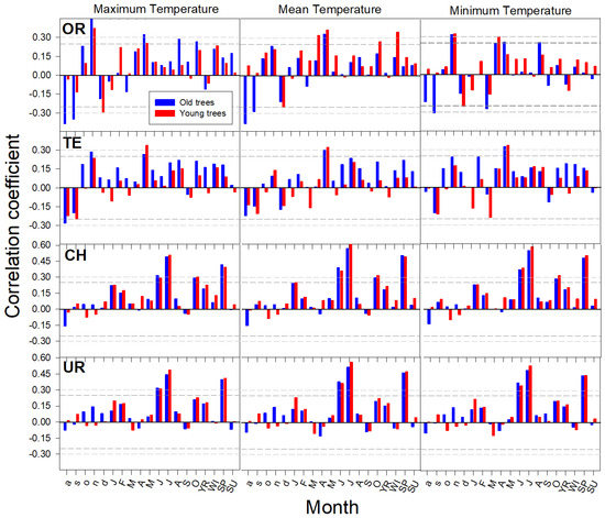 Pearson correlation coefficients calculated between P. uncinata and L. sibirica radial growth age groups (ring-width indexes) and the monthly mean, maximum and minimum temperatures for 1950–2012 in the Pyrenean treelines (OR, TE) and Ural treelines (CH, UR). Growth is related with climate data from the previous (months abbreviated by lowercase letters) and current (months and seasons (YR, annual; WI, winter; SP, spring; SU, summer) abbreviated by uppercase letters) years, the current year being that of tree-ring formation. The significance levels of correlation coefficients are indicated by dashed dark grey lines (p < 0.05) and light grey horizontal lines (p < 0.01).