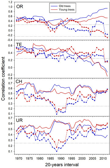 Temporal changes in bootstrapped correlation coefficients using 20-year long intervals shifted by one year for the period 1950–2012 (values are arranged for the last year of each 20-year long interval). Dashed horizontal lines indicate statistically significant correlation coefficients (p < 0.05) for previous maximum November temperature (lines) and current minimum May temperature (symbols) in Pinus uncinata Pyrenean treelines (OR, TE); current (year t) maximum July temperature (lines) and current minimum July temperature (symbols) in Urals Larix sibirica treelines (CH, UR). Sites’ codes are as in Table 1.
