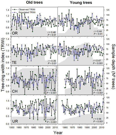 The VS-Lite model accurately predicted the year-to-year variability in TRWi during the 1950–2012 period for the two conifer species (Table 3; Figure 4). The modelled growth responses to temperature (gT) were higher in young trees for OR and CH sites (F = 6.75, p < 0.05), in contrast to the TE and UR sites (Figure 4). The mean growth response to temperature (gT) in the Pyrenean treelines peaked from April (May) to October in OR (TE) site, whilst the gT peaked from May to September in the Ural treelines in response to this extremely cold-limited environment. Tree growth was not limited by soil moisture (gM) as expected in response to high-elevation environment (Figure 5), except for OR site, where the growth constrains by low summer moisture, higher in young trees. The estimated minimum and optimal thresholds (T1, T2 and M1, M2) for growth confirmed the highest sensitivity of young P. uncinata trees and old L. sibirica trees to cold temperatures (maximum T2 value). The estimated higher value of M2 (optimal soil moisture conditions for growth) in P. uncinata confirmed the sensitivity to dry conditions in the Mediterranean treelines, especially in the OR site (Table 3; Figure 5).