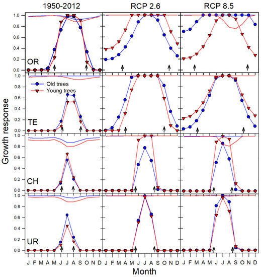 Under the climate scenarios (RCP 2.6 and RCP 8.5), growth at the Pyrenean and Ural studied treelines is forecasted to be increasingly favoured by rising temperatures, i.e., trees will show higher growth rates throughout a longer growing season (Figure 4 and Figure 5). In other words, growth at treeline will be less limited by cold conditions. The Pyrenean OR treeline would experience persistent warmer conditions through the year, causing that water shortage may limit growth in young trees (under RCP 8.5) (Figure 5). On the contrary, the Ural treelines are projected to show mainly higher growth rates, but similar growing season as nowadays (Figure 5). Warming would enhance growth, more in young trees than in old trees for the Ural CH site under both emission scenarios.