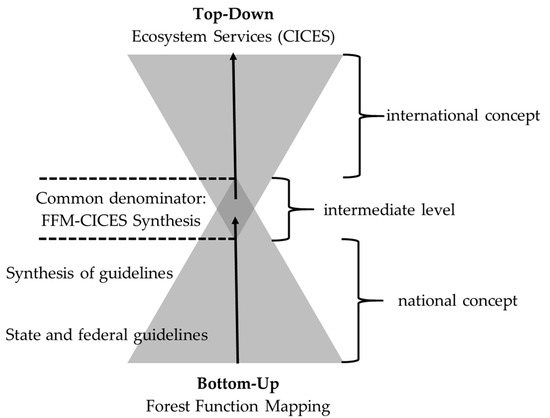 The methodological approach to align FFM and the ESS concept comprises combining a bottom-up with a top-down approach to reconcile concepts of two different governmental levels. The FFM approach is a national concept, designed at a decentralised level (bottom-up). Due to the federal, multi-level structure of the government system in Germany (see below), the majority of German state forest agencies have formulated their own FFM guidelines, to best represent their individual needs. In contrast, CICES—as an internationally applicable concept—is designed at a centralised level (top-down). In this research, the interface between these two levels is called the intermediate level, where the common denominator (FFM-CICES Synthesis) serves as a translator between the common international classification at a centralised level and the more specific, national concept at decentralised governmental levels (see Figure 1).
