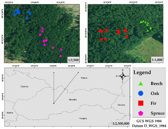 The research area is located in the central part of Slovakia, which belongs to the Kremnica Mountains. The forest stands are unique according to the tree species composition, primarily European beech (Fagus sylvatica L.), sessile oak (Quercus petraea (Matt.) Liebl.), Norway spruce (Picea abies (L.) H. Karst.), and European silver fir (Abies alba Mill.). These four species differ significantly by bark type. Therefore, we chose 10 trees from each tree species. However, the light conditions and slope (0%–5%) were the same for all trees. The age varied from 55 to 80 years. Further, the age was equal, and the trees were located in the same forest stand within each tree species (Figure 1).