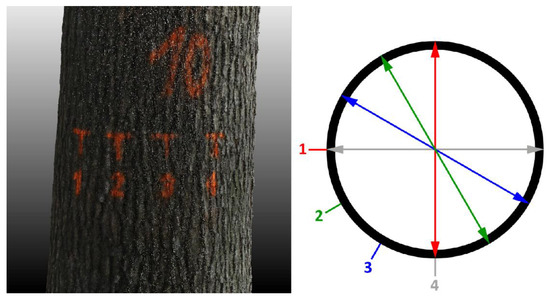 Tree diameter measurements were performed using a caliper and measuring tape. The diameter was measured at three heights: 0.8 m, 1.3 m, and 1.8 m. At each of those height levels, we marked the trunk on its perimeter with four markings. The diameter was measured with a caliper to be perpendicular to those markings, as shown in Figure 2. The caliper measurement was performed four times for every marking. After measuring with the caliper, we also measured the perimeter by measuring the tape four times starting from each of the markings, and then we calculated the diameter. Altogether, we measured the diameter 20 times at each of the three height levels on the trunk, thus 60 times per tree.