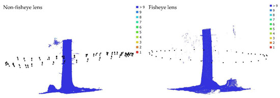 For a fisheye camera, Berveglieri et al. [16] reported an average DBH error of 1.46 cm with a standard deviation of 1.09 cm for a small forest plot consisting of seven trees. They considered these results comparable with manual measurements and values generated from laser scanning. Rodríguez-García et al. [27] studied an application of stereoscopic hemispherical fisheye images and achieved a DBH RMSE of 1.51 cm. Fisheye lenses allow for the coverage of a large area, thereby requiring a lesser number of images. However, their imaging geometry causes large variations in scale, and must be addressed using proper calibration. Some authors [28,29,30] described this calibration process. For example, Berveglieri et al. [16] calibrated a fisheye camera in a terrestrial calibration field composed of coded targets. Our results indicate that, currently, even the “on-the-job” calibration in specialized software can provide results comparable with non-wide-angle cameras. Furthermore, the reprojection errors (Supplementary Materials) ranged from 0.70 pix. to 0.95 pix. for non-fisheye lens and from 0.42 pix. to 0.57 pix. for fisheye lens (Table 5). “Reprojection error is the distance between the point on the image where a reconstructed 3D point can be projected and the original projection of that 3D point detected on the photo and used as a basis for the 3D point reconstruction procedure” [31]. Reprojection errors of fisheye lens are lower for each tree species. Reader should consider that the impact of the automatic camera calibration was not investigated.