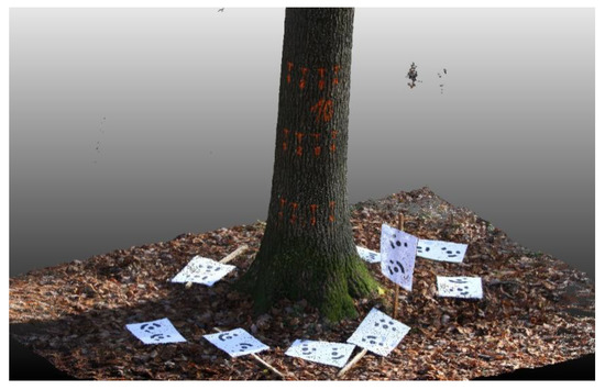 Before the image acquisition, eight A4 papers formatted with 8-bit markers (two on each paper) were placed on the ground, and one was mounted on the reference stick. The reference stick was placed near the trunk (<1 m distance). These markers were used for the scaling and orientation of the point clouds. Altogether, we used nine such papers. For scaling purposes, only one was required. We used multiple papers for verifying the accuracy. The accuracy achieved was under 1 mm in almost all cases. Each tree was captured twice using the non-fisheye lens and subsequently by the fisheye lens. The distance from the tree was maintained at 3 m. The path was a circle around the tree for both lenses. The images were captured in the static position of the operator, and the distance between the positions was approximately 1 m. Two images per position were captured when the non-fisheye lens was used to include the ground and the highest section (1.8 m). When the fisheye lens was used, only one image was required to capture the ground and the highest section. The average number of positions was 35. The average time to collect the images was 4 min for the non-fisheye lens and 2 min for the fisheye lens.