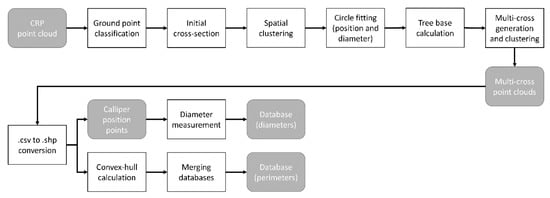 Workflow diagram of the point cloud data processing to the resulted perimeters and diameters of trees.