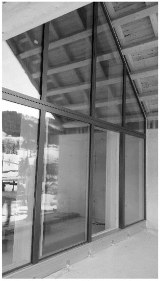 The share of wood-based windows (i.e., wooden and aluminium-wooden profiled windows) is the largest (66%) among certified windows for low-energy houses, due to their high energy efficiency and their beneficial life cycle assessment characteristics [1]. Polyvinyl chloride (PVC) and aluminium windows have 19% and 13% shares, respectively. Contemporary architectural design of buildings integrate wooden products in the building envelope as well as in the interior. One of the reasons for this is that it was proven that the use of natural wood in the buildings has positive psychological, emotional, and health impacts on the people living in such an environment [2]. Windows have an important role (solar gains through glazing), effecting the energy efficiency of the building. Therefore, there has been a gradual increase in the proportion of the transparent part of the building envelope, over the last decade. Windows are more and more frequently placed from the bottom to the top of individual storeys, with heights exceeding 3.0 m, or even over several storeys, with heights exceeding 5.0 m (an example of such building is presented in Figure 1).