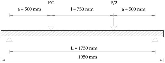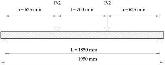 Two test fields, for four-point bending tests, were prepared for two series of hybrid specimens; Series S1 (Figure 3) and Series S2 (Figure 4). The difference between them was in different spans L, lengths of the middle areas l, and the distance of the applied load from the support a. The simply supported beams of Series S1 were 1950 mm long and had a span of L = 1750 mm. Loads of P/2, which were 750 mm apart, were applied at a distance a = 500 mm from the beam supports (Figure 3). The simply supported beams of Series S2 were 1950 mm long and had a span of L = 1850 mm. In this case loads of P/2, which were 700 mm apart, were applied at a distance a = 625 mm from the beam supports (Figure 4). The difference between both series was that the distance between the loads l decreased and the span L increased, in the case of Series S2. With this change, the bending moment with specimens of Series S2 increased, at the same loading force, compared to specimens of Series S1. This step was made in order to decrease the probability that the failure would be caused by shear strength, prior the bending strength would be fully exploited.