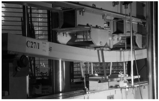 The four-point static bending tests, up to failure, were performed using a Roel Amsler HA 100 universal servo-hydraulic testing machine (Zwick GmbH & Co. KG, Ulm, Germany) (Figure 5).