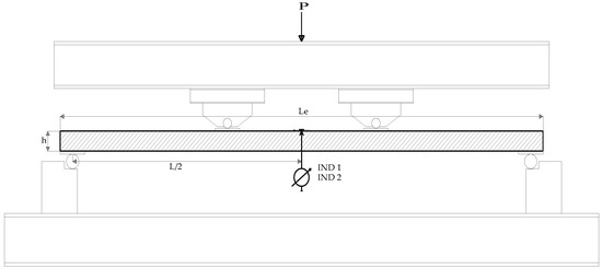 The flexural loading tests were performed in displacement (i.e., stroke) control mode, with an actuator movement rate of 0.1 mm/s, up to failure. In the region between the two applied loads the bending moment was constant, the shear force was zero, and the maximum relative deflection was caused by the bending moments only. On each specimen the deflections were measured at two points using linear voltage displacement transducers (LVDTs) marked as IND in Figure 6.