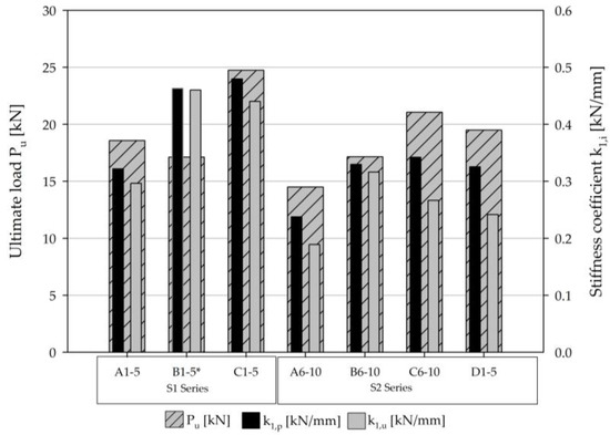 Ultimate load-bearing capacity and stiffness coefficient of the tested specimens of types A, B, C, and D.
