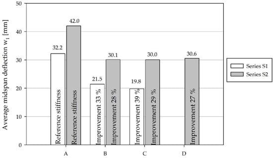 The average measured midspan deflections (w1—calculated as the mean values of IND 1 and 2) of the beam specimens of types A, B, and C, of Series S1, were 32.2 mm, 21.5 mm, and 19.8 mm, respectively (Figure 8). The bending stiffness improvements of the beam specimens of types B and C when compared to the type A reference specimens, were 33% and 39%, respectively. The average midspan deflections of the Series S2 beams of types A, B, C and D amounted to 42.0 mm, 30.1 mm, 30.0 mm, and 30.6 mm, respectively. The improvement in bending stiffness of the hybrid beams of types B, C, and D, compared to that of type A beams, amounted to 28%, 29%, and 27%, respectively. In both series of tests, the midspan deflection of the reinforced hybrid beams was decreased compared to the reference specimens of type A. The largest standard deviation of the midspan deflection was observed with the type A beams, in the case of both series. This was expected, since these specimens were made solely of wood, which is a non-homogeneous material, with significant variations in density and different grain orientations.