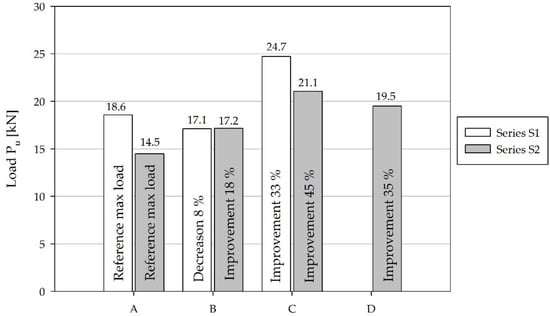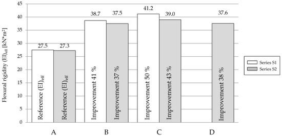 The hybrid beams of type C had the highest flexural rigidity, followed by the beams of type B, the beams of type D, and lastly the beams of type A (Figure 11). For Series S1 the flexural rigidity of type B and C beams was higher in comparison with beams type A by 41% and 50%, respectively. For Series S2, the flexural rigidity of type B, C, and D beams was higher in comparison with beam type A for 37%, 43%, and 38%, respectively.