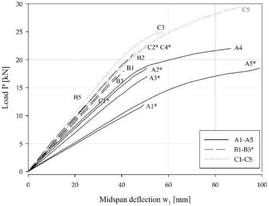 Midspan deflection (w1) was measured in dependence of the load (P), for all beam types of Series S1 and Series S2 (Figure 12 and Figure 13). The angle of the linear part of the curves from the abscissa is defining the bending stiffness; the higher the angle the higher the bending stiffness. Load-bearing capacity is defined by the load at which the curve ends from the exception of specimens marked with * sign, which are specimens, where the full range of at least one LVDT was reached, before the failure occurred.