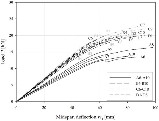 The results show that the ultimate load (Pu) and bending stiffness (ki) were the highest in the case of the type C beam specimens, which had the highest percentage of reinforcements, whereas it was the lowest, as expected, in the case of the type A beam specimens, which had no reinforcement (Figure 7). The comparisons of the bending stiffnesses k1,p and k1,u show the plasticity capacity of the tested beams. In the case of the type B beam specimens, both parameters have almost equal values, which corresponds to an almost linear load-deflection relationship up to failure (Figure 7). The biggest difference between these two parameters (i.e., 34%) occurred in the case of the beams D1–D5, which indicates their nonlinear behaviour between the limit of the proportionality and the ultimate load.
