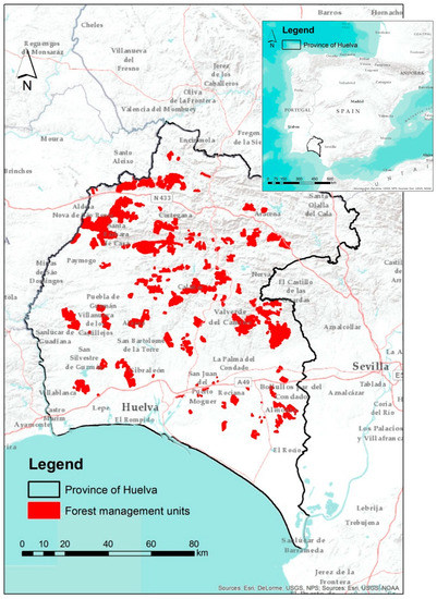 Figure 1 shows the distribution of Ence’s forest management units (FMUs) in the province of Huelva. Most of the forests are found inland in areas of greater or lesser relief within the Sierra Morena mountain range. Nevertheless, the presence of some patches in coastal areas and in the surroundings of the Doñana Natural and National Parks is also significant.