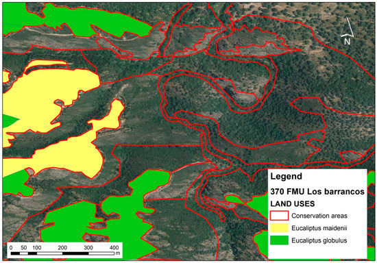 Table 1 shows the synthesis of the area comprised of these management units. There are a total of 183 FMU with an area of 52,022 ha, most of which are owned by Ence. Of the total area, 74.68% (38,850.41 ha) is, on the whole, planted with Eucaliptus globulus Labill, for logging purposes, with the remaining 25.32% (13,172.32 ha) covered by natural or semi-natural vegetation formations. These latter constitute the conservation areas and include grasslands, scrublands, rocky areas, forests or meadows of Quercus spp. Infrastructures such as firewalls or reservoirs, among others, can also be found, though to a lesser extent. Figure 2 shows one of the conservation areas that are generally comprised of river valleys, banks, rocks, meadows and remnants of the original sclerophyllous forest, in the eucalyptus matrix.