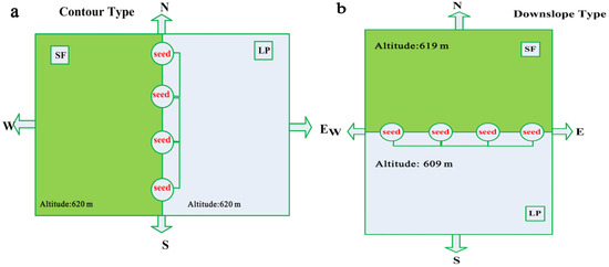 The sketch map of seed stations setting in two typical spatial distribution patterns of larch plantations (LPs) within a secondary forests (SFs). (a) Seed station setting in contour type stands. (b) Seed station setting in downslope type stands and the south is the download direction of LPs from SFs.