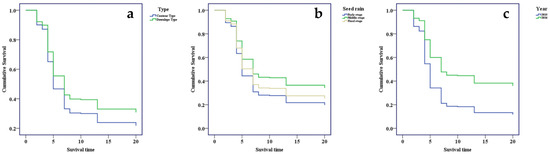 Seed removal rate in larch plantations with contour type and downslope type at three stages of seed rain in 2015 (non-masting year) and 2016 (masting year) by using the Cox Regression. (a) Seed removal rate for two types of larch plantations (i.e., contour type and downslope type). (b) Seed removal rate for three stages of seed rain (i.e., early, middle and final stages). (c) Seed removal rate for the year of 2015 and 2016.