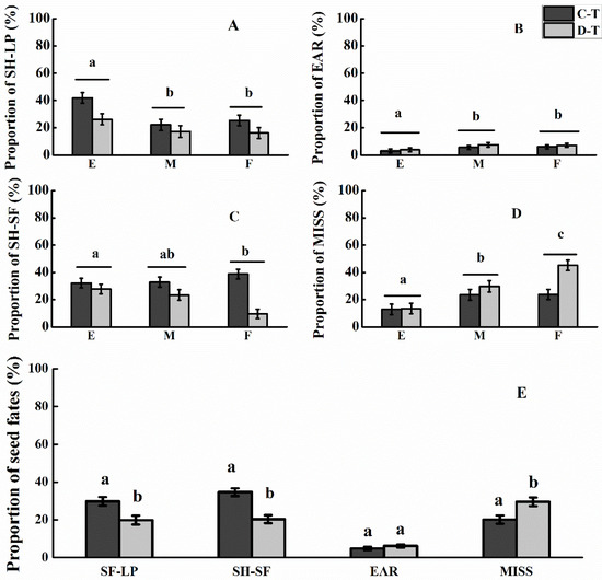 Seed fates of Juglans mandshurica in larch plantations with contour type (C-T) and downslope type (D-T) at three stages of seed rain. (A) The proportion of SH-LP at three stages of seed rain; (B) The proportion of EARat three stages of seed rain; (C) The proportion of SH-SF at three stages of seed rain; (D) The proportion of SH-SF at three stages of seed rain; (E) Seed fates of Juglans mandshurica with contour type (C-T) and downslope type (D-T). SH-LP: scatter-hoarding in the larch plantation; SH-SF: scatter-hoarding in the second forest; EAR: removed and eaten leaving only plastic tags and seed fragments; MISS: missing where their true fates were unknown. E: early stage of seed rain; M: middle stage of seed rain; F: final stage of seed rain.
