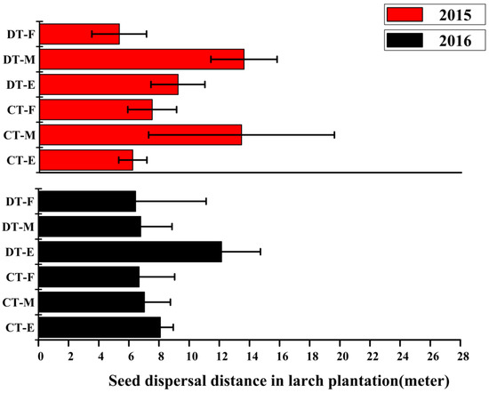 Seed dispersal distance in larch plantations with contour type and downslope type at three stages of seed rain in 2015 (non-masting year) and 2016 (masting year). CT-E: early stage of seed rain in the contour type of stands; CT-M: middle stage of seed rain in the contour type; CT-F: final stage of seed rain in the contour type; DT-E: early stage of seed rain in the downslope type; DT-M: middle stage of seed rain in the downslope type; DT-F: final stage of seed rain in the downslope type.