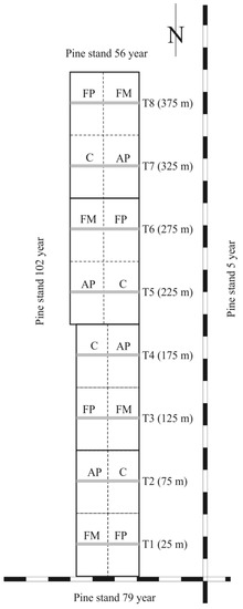Field research was conducted in Poland’s Spychowo Forest District, ca. 150 km north-east of Warsaw (53°36’ N, 21°20’ E; WGS 84). The soil in the study area is classified as podsolic, formed on loose sands with typical more humus. Specifically, trials were run in a clear-cut area 400 m long with a width of 50 m in the narrower half and 64 in the wider. Before felling, the stand had comprised 129-year-old Scots pine trees (P. sylvestris) (with a stand volume of 260 m3 ha−1, a stand density of 390 stems/ha, an average tree height of 24.5 m, and average tree diameter at breast height (dbh) of 34 cm). To the east, the felled area bordered a plantation with pines regenerating naturally, with an admixture of spruce. On the other three sides it was surrounded by pine stands of various ages (79 years to the south, 102 years to the west and 56 years to the north-west). The herb layer was dominated by Dicranum polysetum Sw., D. scoparium (L.) Hedw., Vaccinium myrtillus L., V. vitis-idaea L., Calluna vulgaris (L.) Hull, Luzula pilosa (L.) Willd, Festuca ovina L. and Lycopodium annotinum L. The plant community was classified as Peucedano-Pinetum typicum Mat. [39]—i.e., the most nutrient-poor site type, accounting for 20.9% of Poland’s forest [2]. It is mainly in this habitat that natural regeneration of Scots pine proves possible, as in more fertile site types, seedlings are outcompeted by herbs.