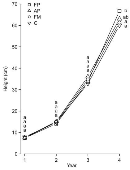Over the first three years, the growth of seedlings expressed in terms of height did not differ significantly from one treatment to another. In contrast, after the fourth season, pines growing in soils prepared using the FP method had reached a similar height to those with the AP treatment, with these now being significantly taller than FM or no-MSP trees (Figure 2, Table 2).