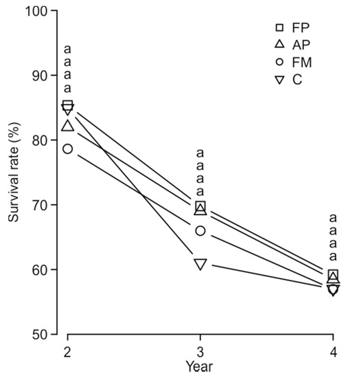 After the second, third and fourth years of the experiment, no differences in survival among pines were to be noted in relations to treatment. After four years, survival rates could be ordered as follows: FP—59.2%, AP—58.5%, FM—57.0% and C—57.0% (Figure 4, Table 2).