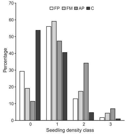 In addition to the density of occurrence of seedlings, a key parameter characterising natural regeneration is the evenness of the seedling surface cover. A high proportion of zero-seedling plots most often points to considerable microhabitat differentiation across a clear-cut area [43]. Analysis of data broken down to the 1 m2-plot level—by reference to different seedling density classes—confirms differentiated conditions for germination and for the growth of naturally regenerating pine seedlings during their first years. The most favourable circumstances were those of AP treatment, with just 11.4% of the plots supporting no seedlings, and with the greatest proportion (7%) of plots assigned to class 3 (denoting more than 10 seedlings m−2).