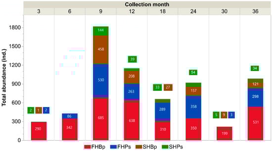 In total, 6466 mite individuals were recorded. Overall, higher total abundance was recorded from stands growing in FH (5174 ind. = individuals) than from the SH (1292). Total number of mite individuals was higher in Bp in comparison with Ps stands, both in FH (3345 vs. 1829 ind., respectively) and SH (981 vs. 311). The highest total number of mites was found in litterbags with oak litter (2063 ind.), whereas for other litter types total abundance was similar (interval: 1455–1482). In Bp growing in FH, total mite abundance was 6.7 (alder), 5.1 (pine), 3.6 (birch) and 1.9 (oak) fold higher than on the SH. In Ps stands growing in FH, total mite number was 8.7 (alder), 7.3 (birch), 4.8 (oak) and 4.7 (pine) fold higher than on the SH (Table A2). In each collection date, the total mite abundance was highest in Bp stands growing in FH; only after 2 years from the beginning of the experiment, were there similar total abundances in Ps and Bp stands growing in FH (358 and 350 ind., respectively). Single specimens were found only after 3 and 30 months from the beginning of the experiment in Ps stands on both habitats, as well as in Bp stands on the SH. After 6 months from the beginning of the study no mites were found on the SH. Altogether, the highest total number of mites was found 9 months after establishment of the experiment (1817 ind.), whereas the lowest numbers were found after 3 and 30 months (295 and 216, respectively) (Figure 1).