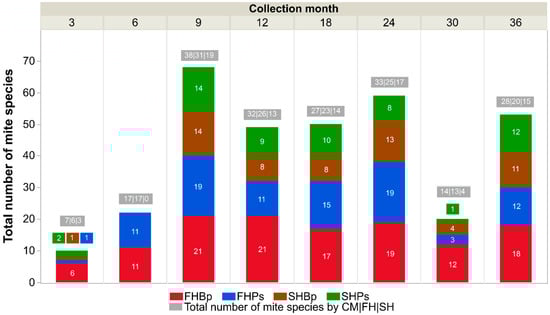 Total number of mite species recorded in Betula pendula (Bp) and Pinus sylvestris (Ps) stands growing in forest habitat (FH) and spoil heap (SH). Data are shown for each collection month (CM) during the experiment. When total abundance was very low, we have added numbers and respective colors above the bars.