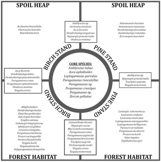 Additionally, in order to determine the ecological features of species composition within the habitats and stand types studied, we used the selection of mite species into exclusive, core and common taxa after Kamczyc et al. []. Core species were taxa which occurred on all habitats and stand types investigated, whereas exclusive species refer to taxa which were present in only one stand type. Common species were taxa inhabiting and indicated from a minimum of two stand types. Similar divisions were made by Skubała [], and Ulrich and Zalewski [].