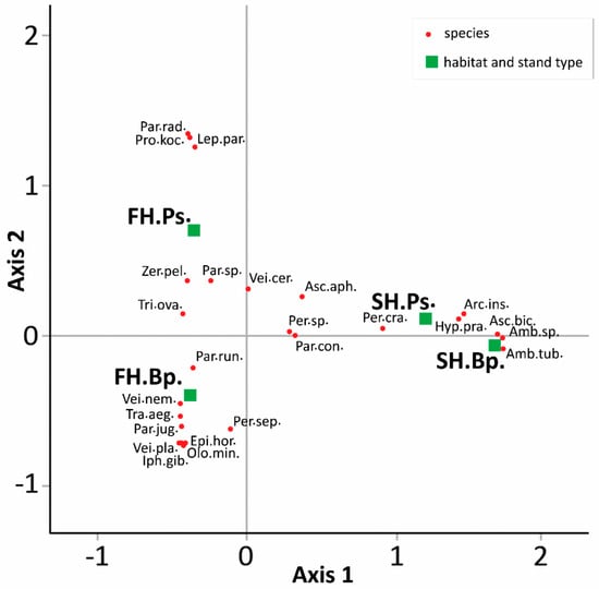 Correspondence analysis (CA) ordination diagram for the 25 most numerous mite taxa (n > 10). Habitat types are separated along Axis 1, while stands types are separated along Axis 2. Abbreviations: FH.Bp.—forest habitat-birch stand, FH.Ps.—forest habitat-pine stand, SH.Bp.—spoil heap-birch stand, SH.Ps.—spoil heap-pine stand, Amb.sp.—Amblyseius sp., Amb.tub.—Amblyseius tubae Karg, Arc.ins.—Arctoseius insularis Willmann, Asc.aph.—Asca aphidioides Linneaeus, Asc.bic.—Asca bicornis Canestrini et Fanzago, Epi.hor.—Epicriopsis horridus Kramer, Hyp.pra.—Hypoaspis praesternalis Willmann, Iph.gib.—Iphidiozercon gibbus Berlese, Lep.par.—Leptogamasus parvulus Berlese, Par.con.—Paragamasus conus Karg, Par.jug.—Paragamasus jugincola Athias-Henriot, Par.rad.—Parazercon radiatus Berlese, Per.run.—Pergamasus runcatellus Berlese, Par.sp.—Paragamasus sp., Per.cra.—Pergamasus crassipes Linneaeus, Per.sep.—Pergamasus septentrionalis Oudemans, Per.sp.—Pergamasus sp., Pro.koc.—Prozercon kochi Sellnick, Tra.aeg.—Trachytes aegrota C.L. Koch, Tri.ova.—Trichouropoda ovalis C.L. Koch, Olo.min.—Olodiscus minima Kramer, Vei.cer.—Veigaia cervus Kramer, Vei.nem.—Veigaia nemorensis C.L. Koch, Vei.pla.—Veigaia planicola Berlese, Zer.pel.—Zercon peltatus C.L. Koch.