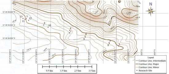 In March 2007, 13 forest plots were established in the research area and numbered 1~13. No. 1 was unthinned and served as the control (Figure 1). The forest environment factors such as gradient, slope aspect, and stand type were similar for all plots. The silvicultural interventions for all plots before thinning were focused on the cutting of shrubs and herbs, which seriously affected the growth of target species and sapling. Thinning intensity was based on the ratio of logged volume to total volume in accordance with timber forest management requirements, which govern cutting of trees in larger stand densities, no growth trees, and non-target species. Thinning intensities were as follows for each plot: 0%, 3.4%, 6.2%, 12.5%, 16.8%, 20.9%, 25.5%, 34.4%, 40.0%, 47.9%, 50.6%, 59.9%, and 67.3%. Forest densities varied under each thinning intensity grade (Table 1). In August 2017, we investigated all trees (DBH (diameter at breast height) of 1.3 m) ≥5 cm and recorded DBH, tree height, crown width, tree species, and location.
