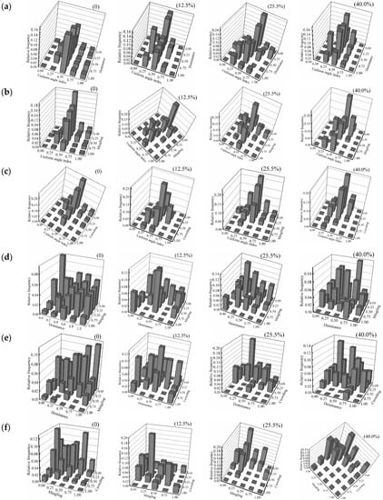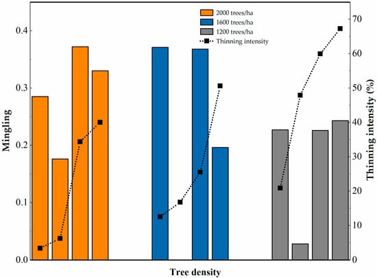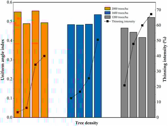 To better understand the relationship among the forest spatial structure indexes, this paper analyzed the binary distribution of the indexes for those plots with the greatest comprehensive evaluation values: 12.5%, 25.5%, and 40.0%. The unthinned plot was evaluated as well (Figure 6).